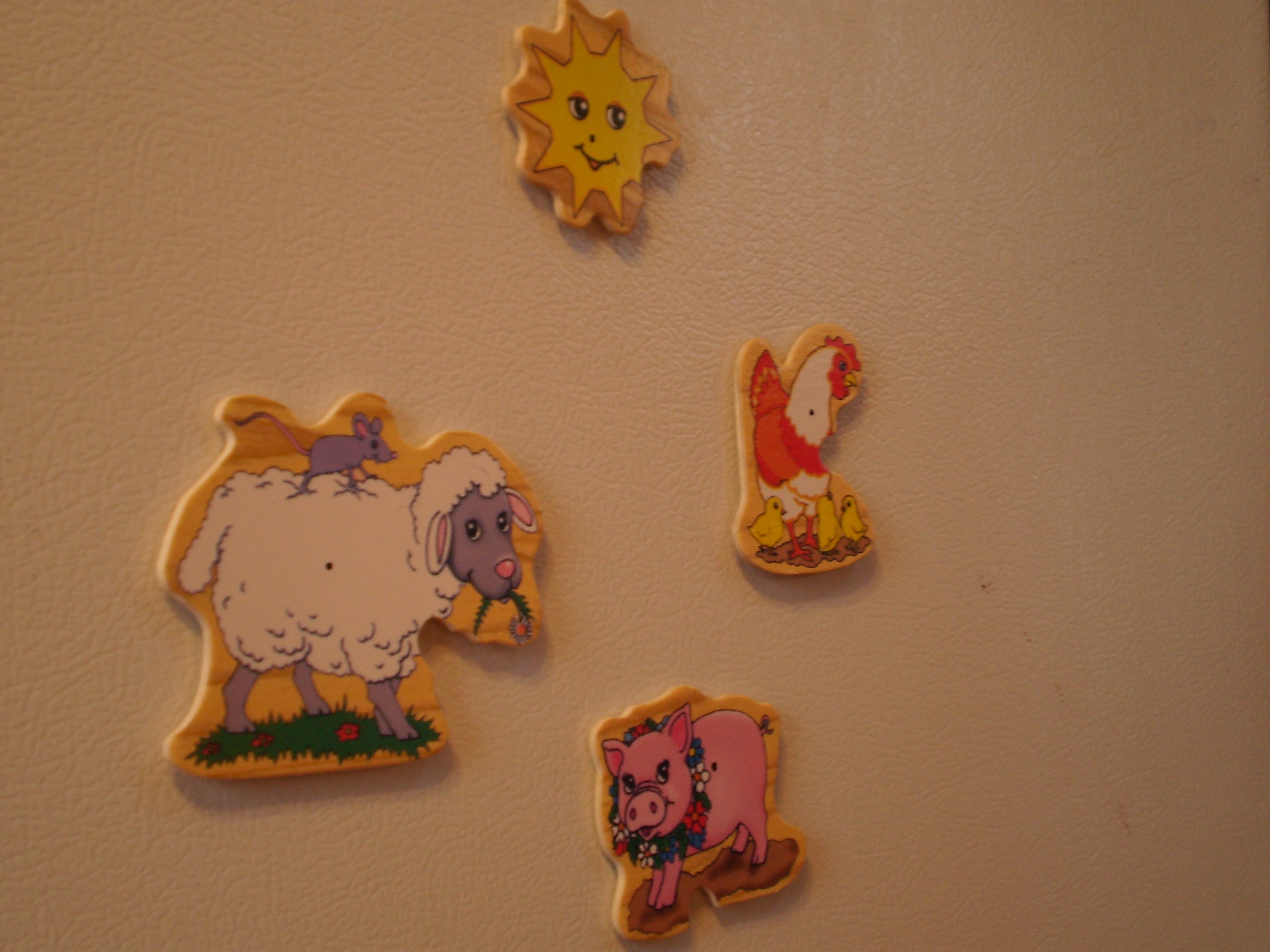 His friends, former members of the On the Farm puzzle crew, now live on the fridge at 2 year old height.