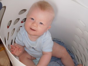 3. Use household items: Any baby book you read is going to encourage you to let your little one have their own drawer in the kitchen. Our little one was too loud with the pots and pans for mommy’s comfort, but a drawer full of plastic bowls and lids was perfect for him (and us). He’s played with empty plastic hampers, cardboard boxes, tupperware items, and wooden spoons. He has also finger-painted with jello, chocolate pudding, and even ketchup. I’m always looking for creative and cheap ideas using things we already have around the house.