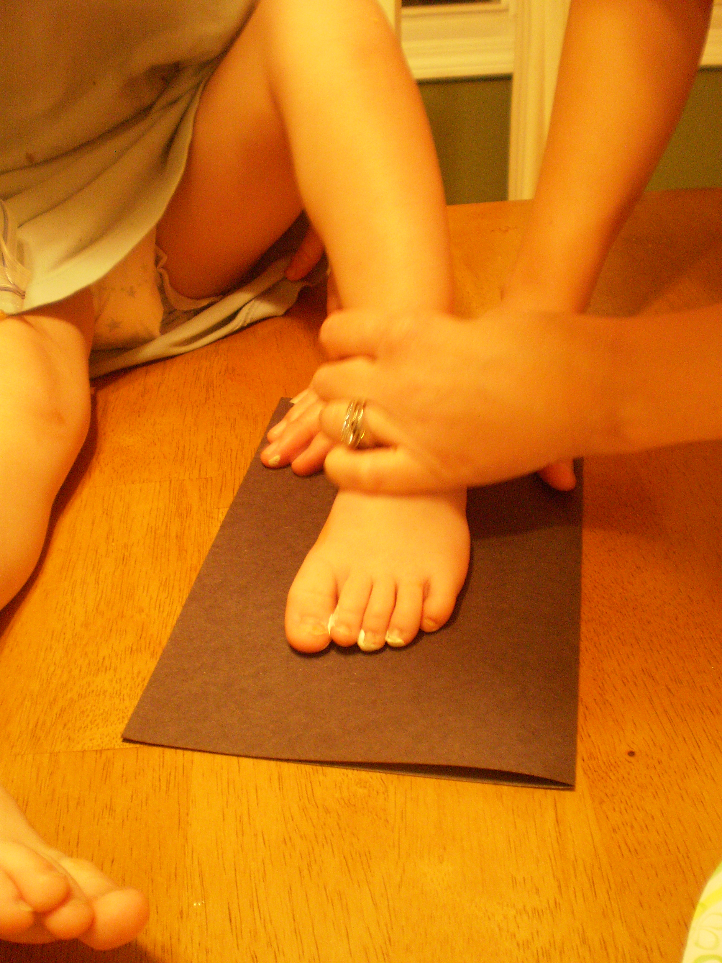 2. Press freshly painted foot onto the black paper. We made two of them.