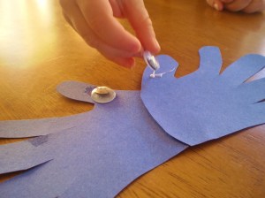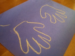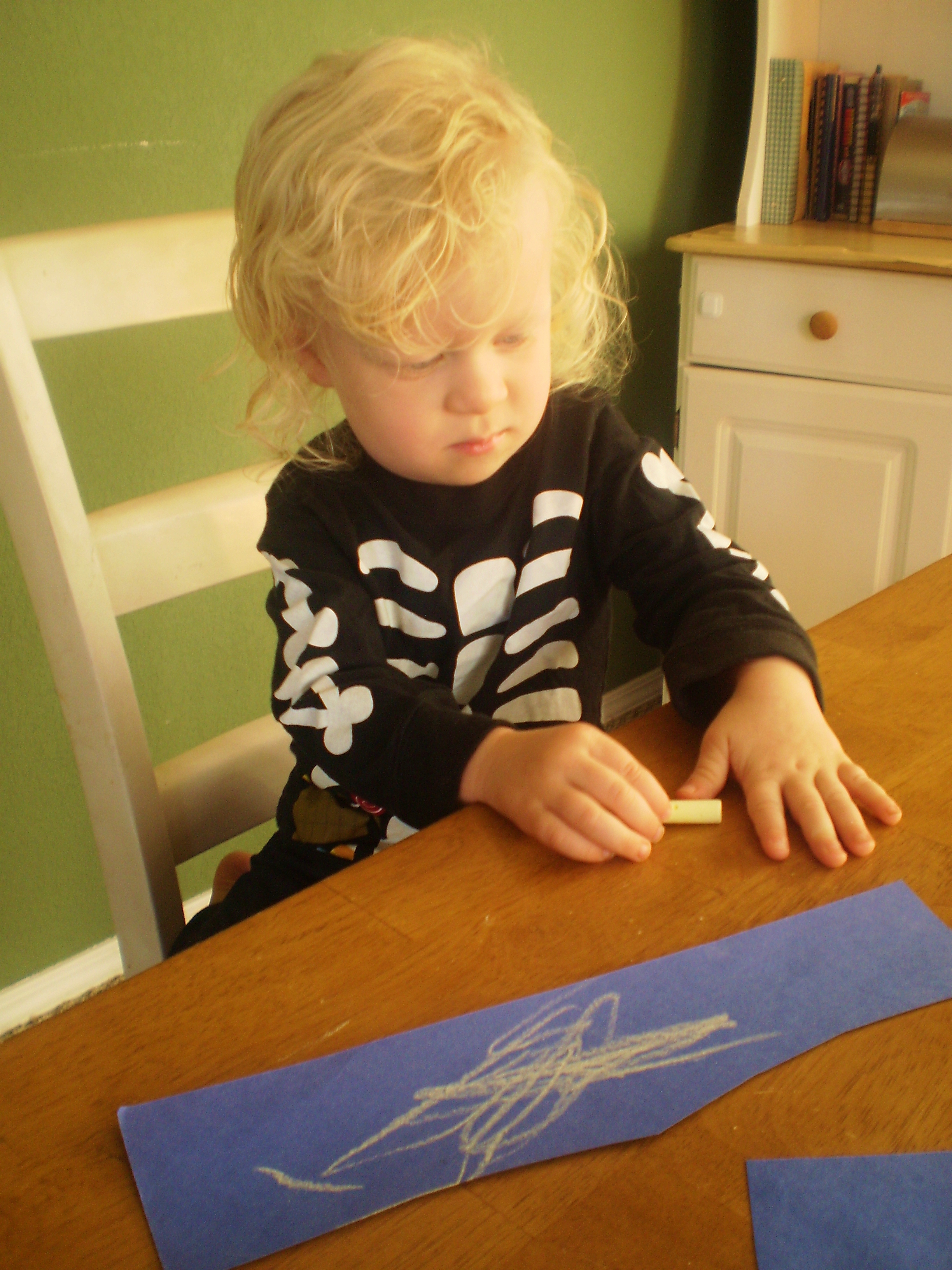 3. Cut both hands out. I let my little skeleton color with the chalk to stay busy while I cut.