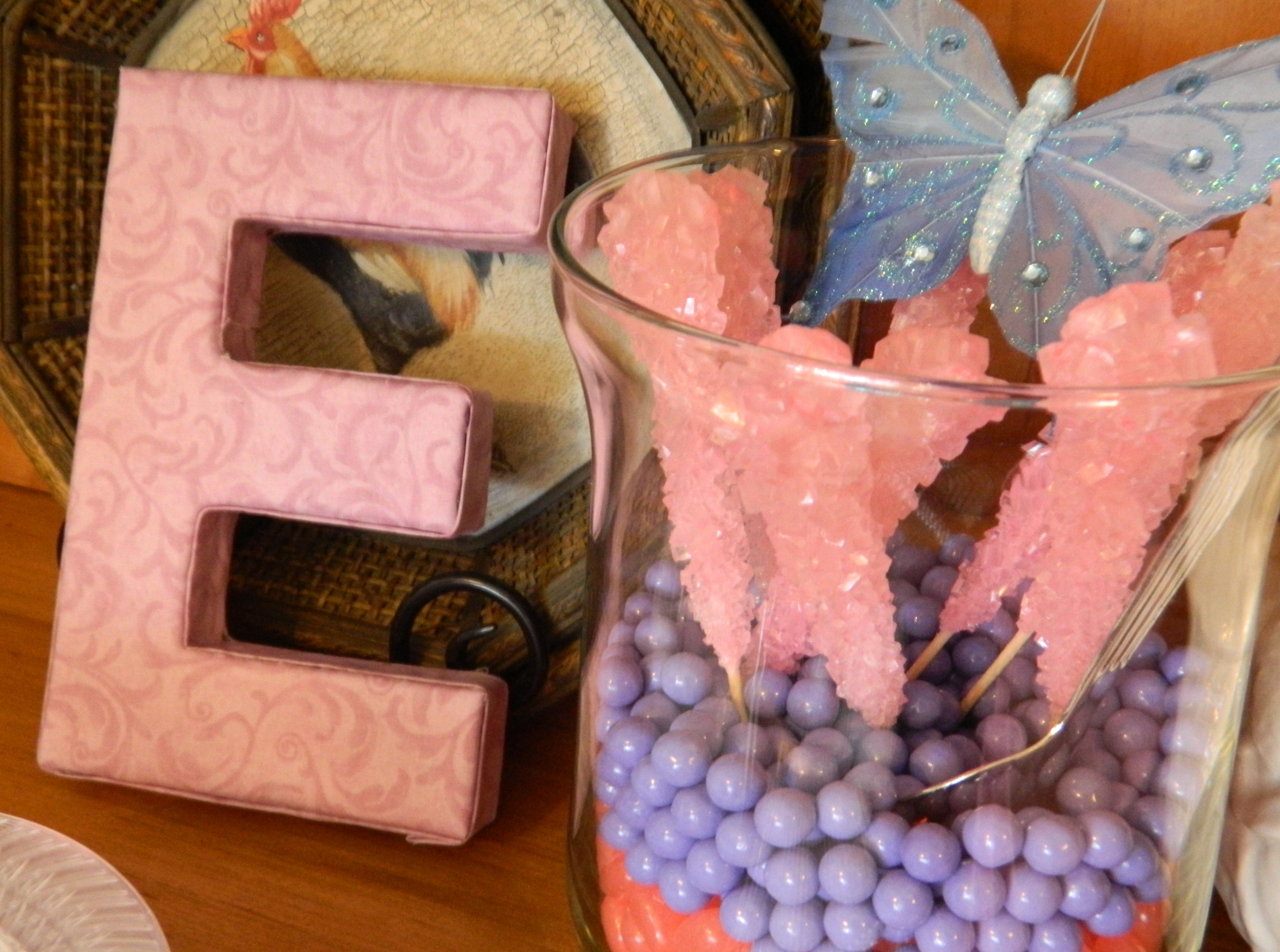 Soon I’ll do a post on the super easy way to make these adorable fabric-covered letters to hang on the wall of a child’s room. I have Little’s name spelled out in coordinating colors on his wall. I love candy jars at showers and parties, and I just can’t resist how whimsical it is to have candies as decoration {and treats!} Everyone turns into a kid when you offer them candy. Those cute glittery butterflies also came from Michael’s…in the $1 bin! The large hurricane jar? Dollar General for $3!