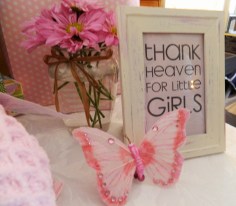 I simply ran a google image search for the phrase “Thank heaven for little girls” and discovered that creative and talented Kim over at the blog Seriously Daisies had an adorable FREE printable ready-made just for me! {Okay, maybe not just for me, but I sure appreciated it!} I simply printed out the sign and put it in a dollar store frame I’d painted to look shabby-chic. I painted one layer of the frame with a lavender paint and then spray painted over that. When it all dried I took a fine nail file and sanded some of the edges and corners just enough for the lavender paint underneath to peek through. The effects were adorable.