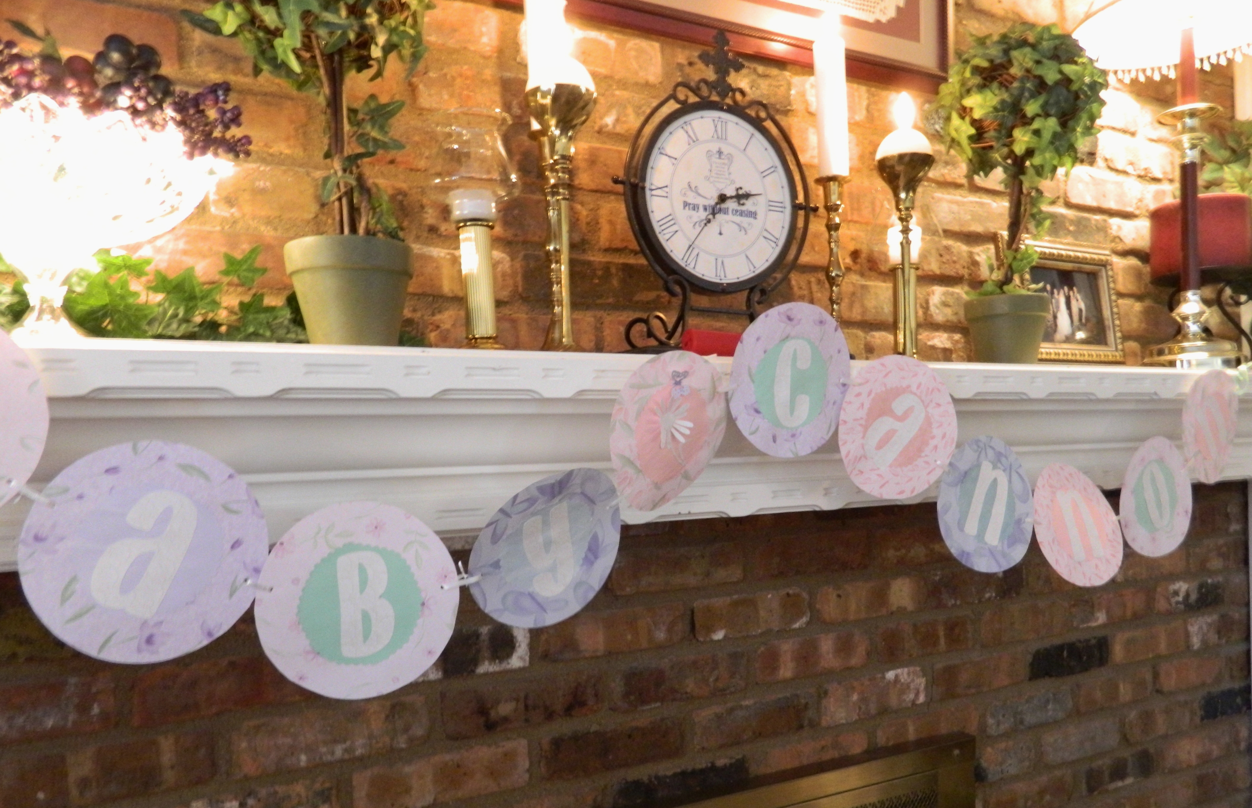 I’m sorry this picture didn’t turn out perfect. I should have taken more. Oh well. I still wanted to show it off because it’s super simple to make a banner yourself. I traced the circles on some colorful scrapbooking paper in coordinating colors using a dessert plate as my guide. The smaller circles in the middle were given a decorative look using some pinking scissors. I happen to have a Cricut, so that made the letters super easy, but even if you don’t, you can print out the letters on your computer in a font you like and then trace them and cut them out on a cute piece of cardstock. Each letter sign was connected with a small piece of ribbon tied through a couple of small holes I punched in the paper.