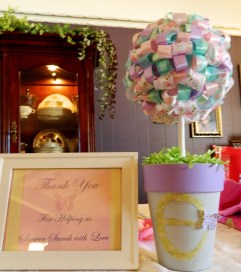 I painted the birdhouse {there were actually 2 at the shower}, which I purchased for $1 each at Michael’s. The smaller vases with the daisies came from the dollar store for $1 each. When in doubt about how to decorate for ANY event, buy fresh flowers! The colors are so beautiful and eye-catching, you really can never go wrong with some of God’s own designs.