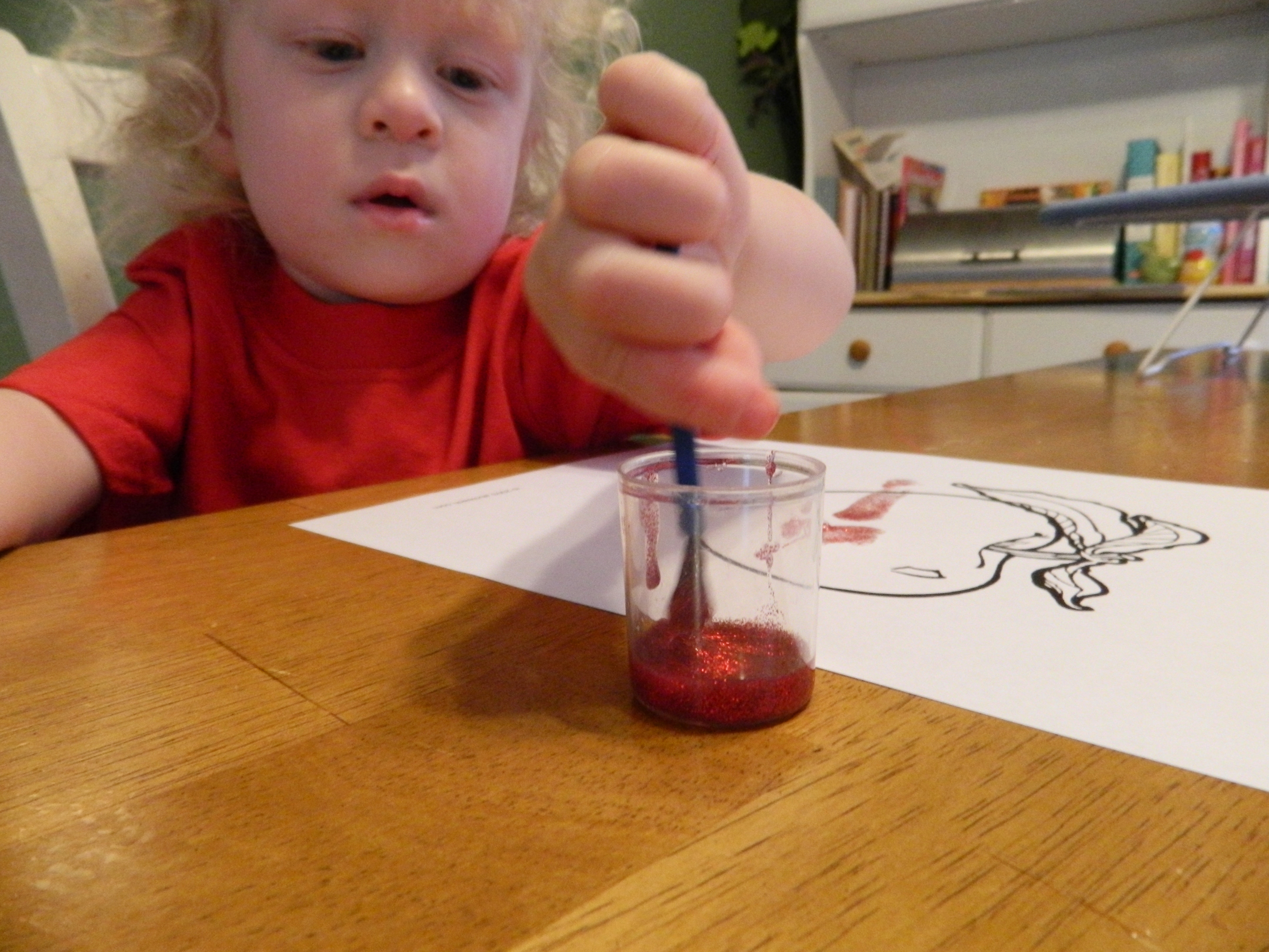 Today turned out to be a great day to start our “school” sessions, because it was raining and cold outside all day. We read the Bible passage and discussed the story in terms he might understand. At the most, he giggled and said, “Jesus loves me!” with enthusiasm, so it’s a start. The lesson introduced the number one, the letter A, the color red, and the triangle. Since it’s a go-at-your-own pace kind of program, I decided to just work on the letter A and the color red for today. He knows his shapes anyway, and I was worried that if I piled too much on in one day I might lose his attention. The entire activity and lesson took us about an hour. We started at 8 and ended at 9, and by 9:10 he was off playing happily in his room. Short and sweet, the way it should be for a barely three year old little boy.