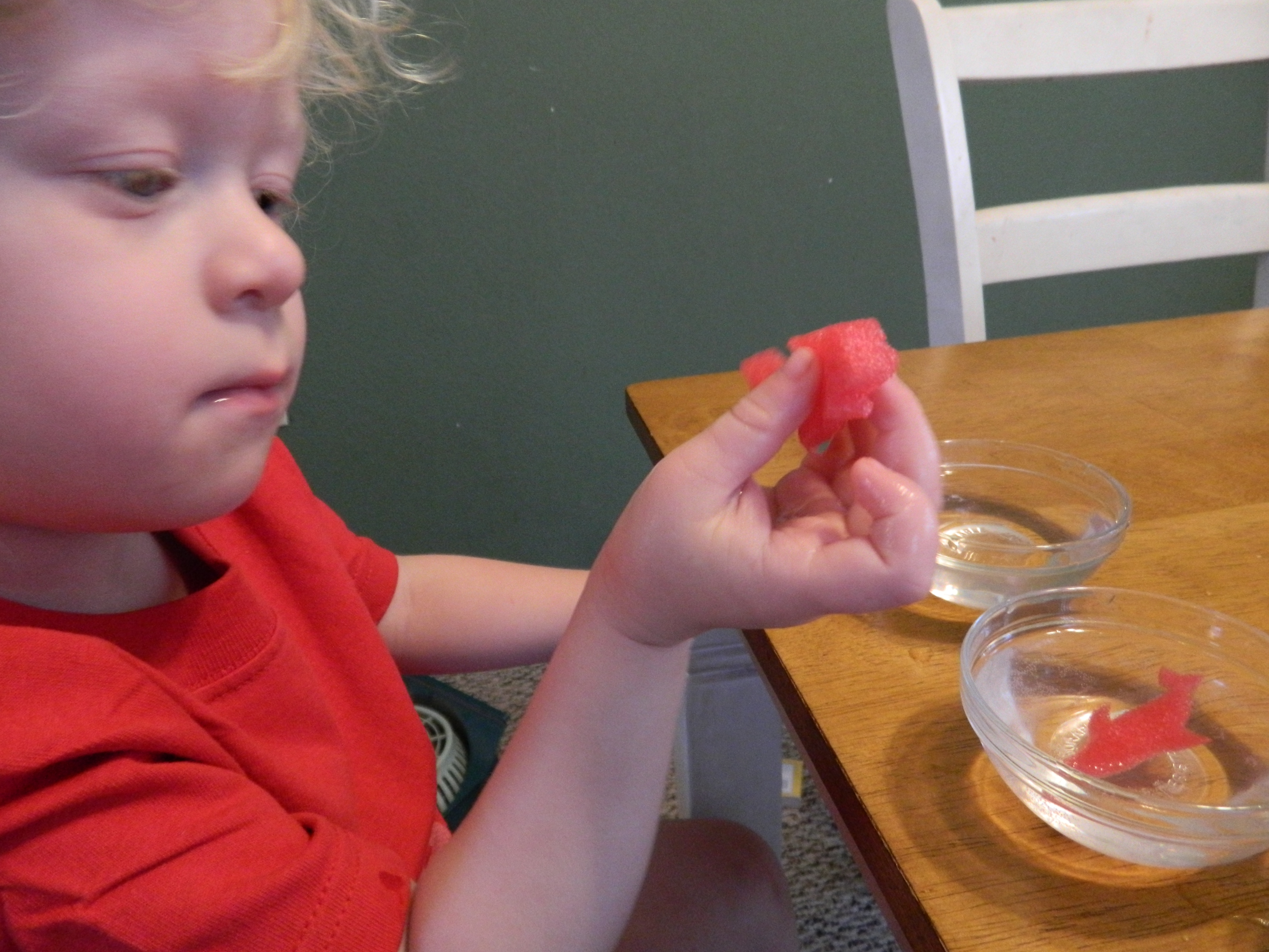 We got a package of critter-growing capsules for his birthday, the kind that look like little pills and grow into sponges in water. I wasn’t sure if he’d have the patience to wait for them to expand, but I went ahead and pulled out the three red ones in the package to use for today’s lesson about the color red and thought it was worth a try. When he finished his crafts, he crawled up in my lap and watched them expand and unfurl, and I’m not sure I’ve ever seen him so focused or observant. He loved it. He had a wonderful time guessing what the shapes were before they were fully expanded, and excitedly squealed, “They’re growing!” as each one started popping out of its pod. It was an unexpected hit. It just reminds me more and more that it doesn’t have to cost you a ton of money to entertain and educate your kids right at home. It was such an encouraging morning.