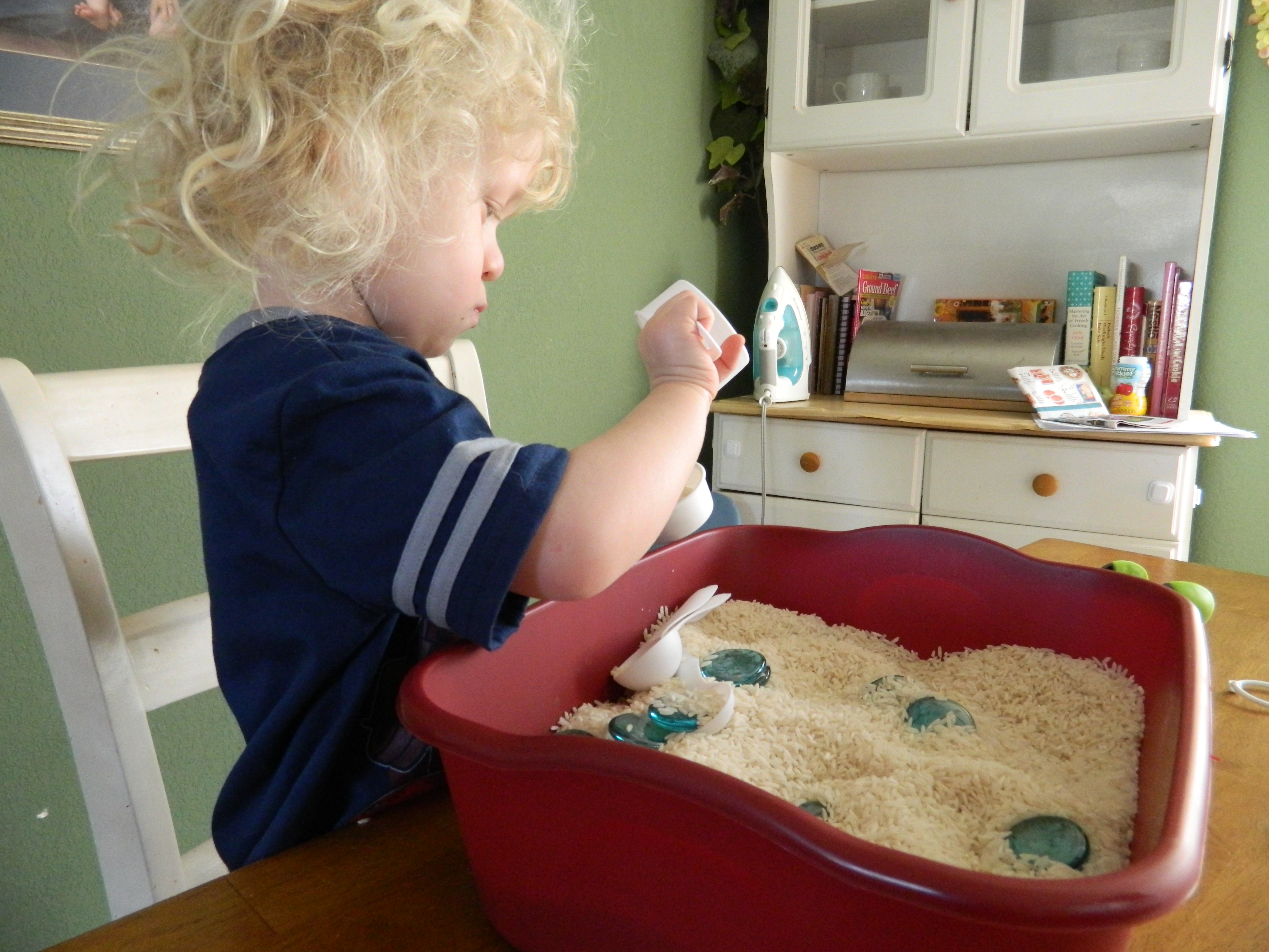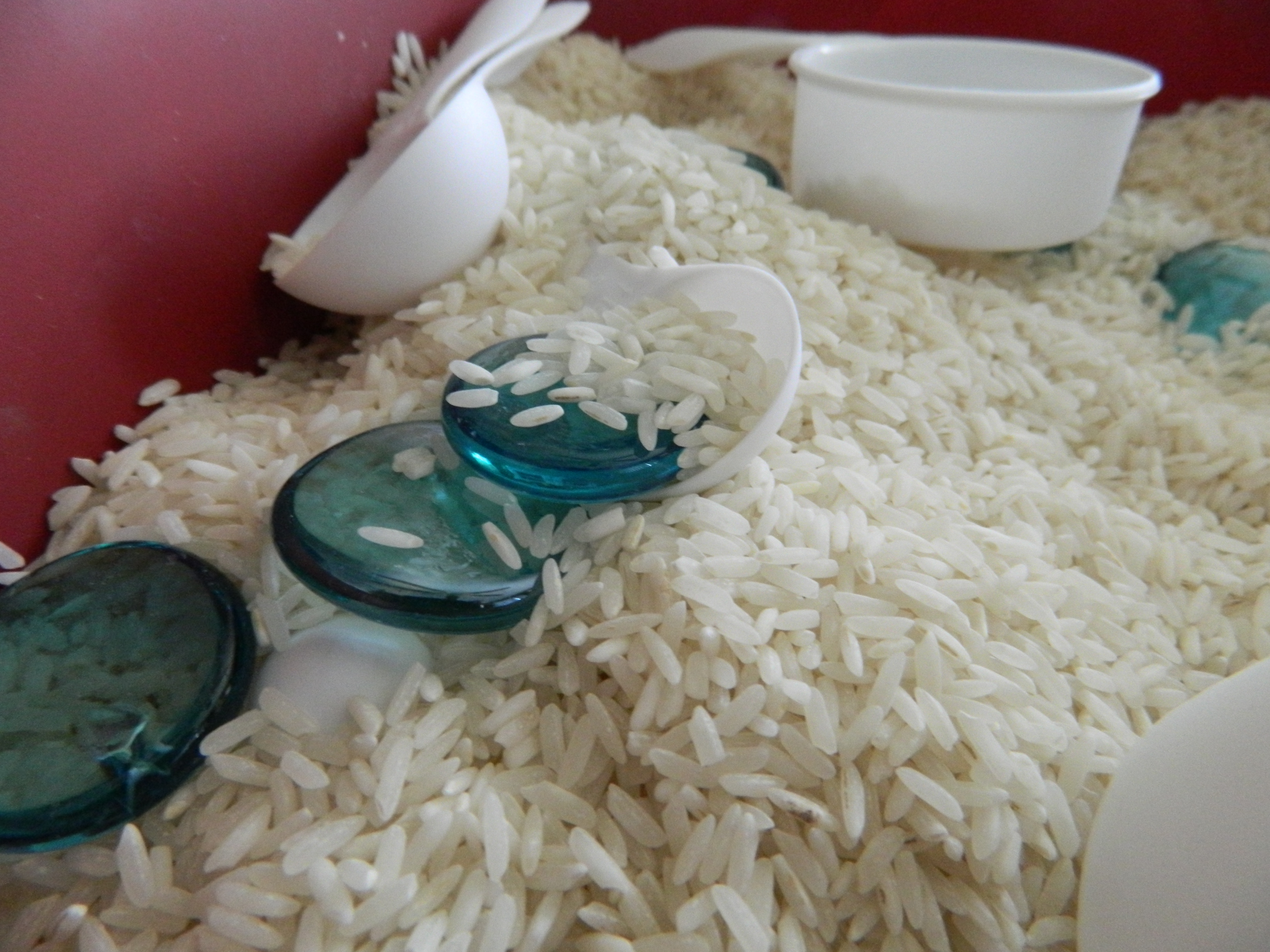 So far it’s a hit. Of course, there’s rice EVERYWHERE, but that’s kind of part of the process. He’ll learn to keep it in the tub {hopefully}. He’s scooped, poured, transferred, carefully practicing his dexterity with the tongs, and just having a fun time overall letting the tiny pieces of rice run through his hands. So I was thinking of some other things that might be great in a sensory bin or sensory table, and this is the list I came up with: