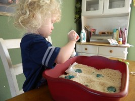 We have one for both kids. They love them! I used several different kinds of dried beans, some plastic dinosaurs and bugs and lizzards, with some different gems and rocks. They each have small horses, a couple of matchbox cars, a handful of rice, and spoons/ladles/forks/cups/etc. My sister-in-law did hers with dried pasta and rice with all sorts of toys. I’ve seen them with the fake snow the craft stores carry in the winter. The possibilities are practically endless. Love them! And ours stay under the bench on the patio. It’s enclosed so good for all weather. We used to just get Emmas out when we were playing outside-that helped keep the fun and intrigue.