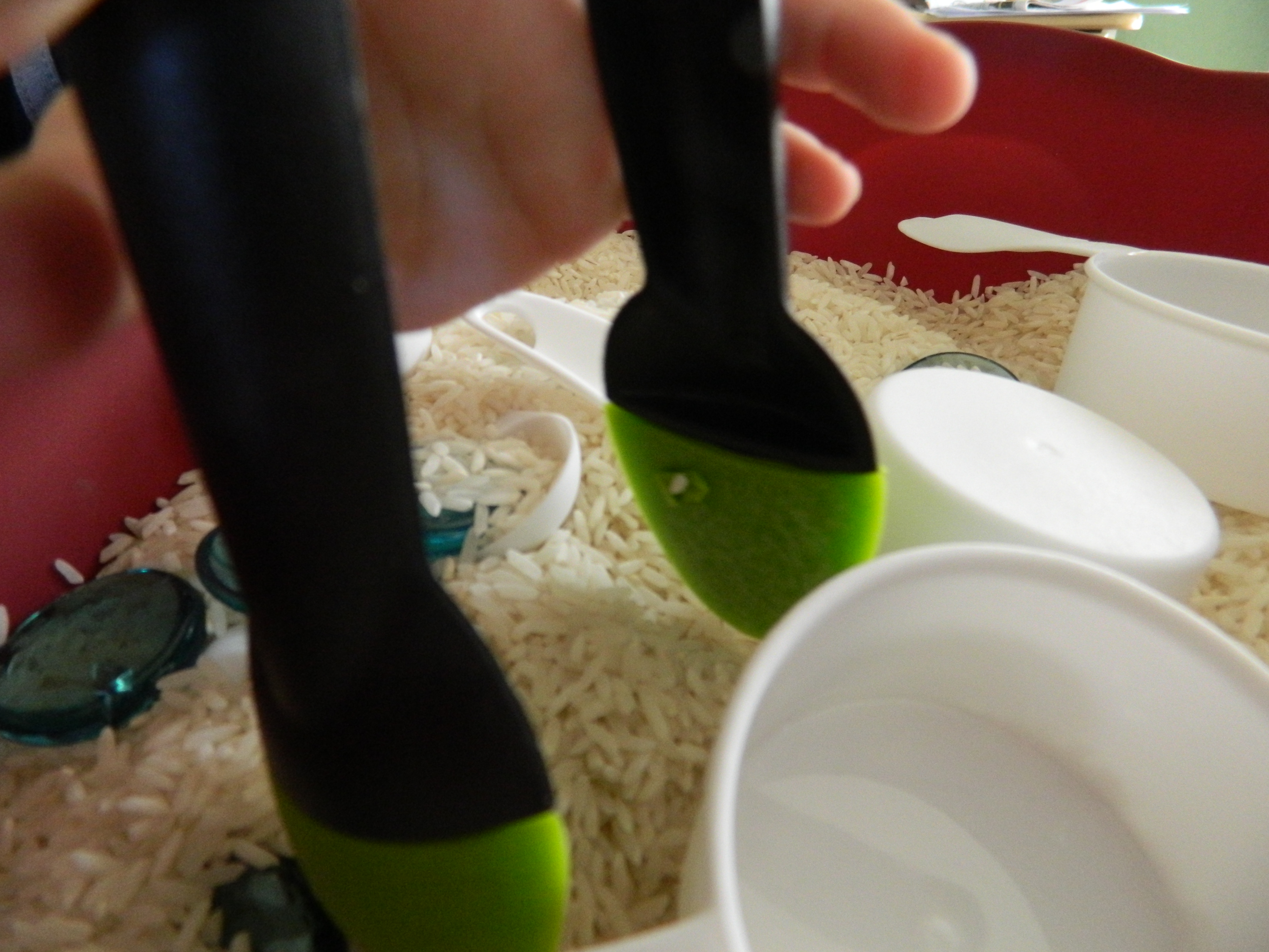 • Cups, spoons, sifters, ladles, tongs, scoops, funnels, and anything else that they can manipulate and tinker with. I found a set of measuring spoons and measuring cups and a huge set of plastic tongs at Dollar Tree.