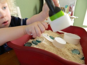 • That’s an awesome idea- I was having a hard time trying to figure out where to put it when I picked it all up today. I love the idea of having it outside under a covered area (or just with a lid on it). In researching more about them, I’ve seen all kinds of themed ones. One that I think I’ll do for Easter has plastic eggs in there instead of the normal scoops and spoons. They can fill the eggs up with whatever is in there, shake them, sift them, sort them, transfer them, stack them, whatever. Cute ideas!