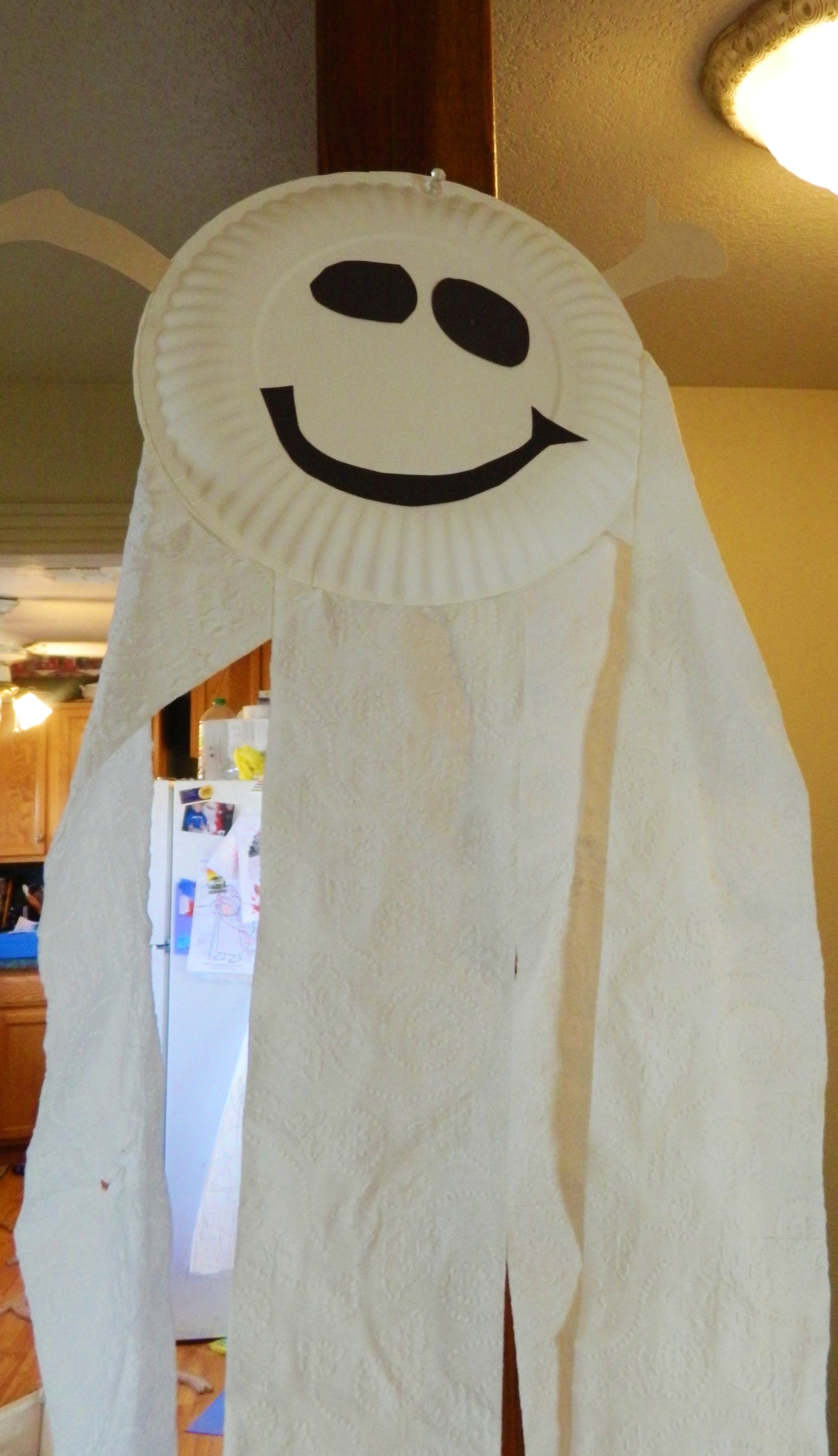 I cut out the eyes and mouth last night before our play date since the boys aren’t quite old enough for great scissor use yet. The rest is pretty basic. Assemble as you see in the picture. They really seemed to enjoy it. It’s one of those crafts you enjoy even more after it’s dry and done, because you can actually hang it outside as a wind sock. Little Bug was really excited. I found this craft through Pinterest from Clean & Scentsible.