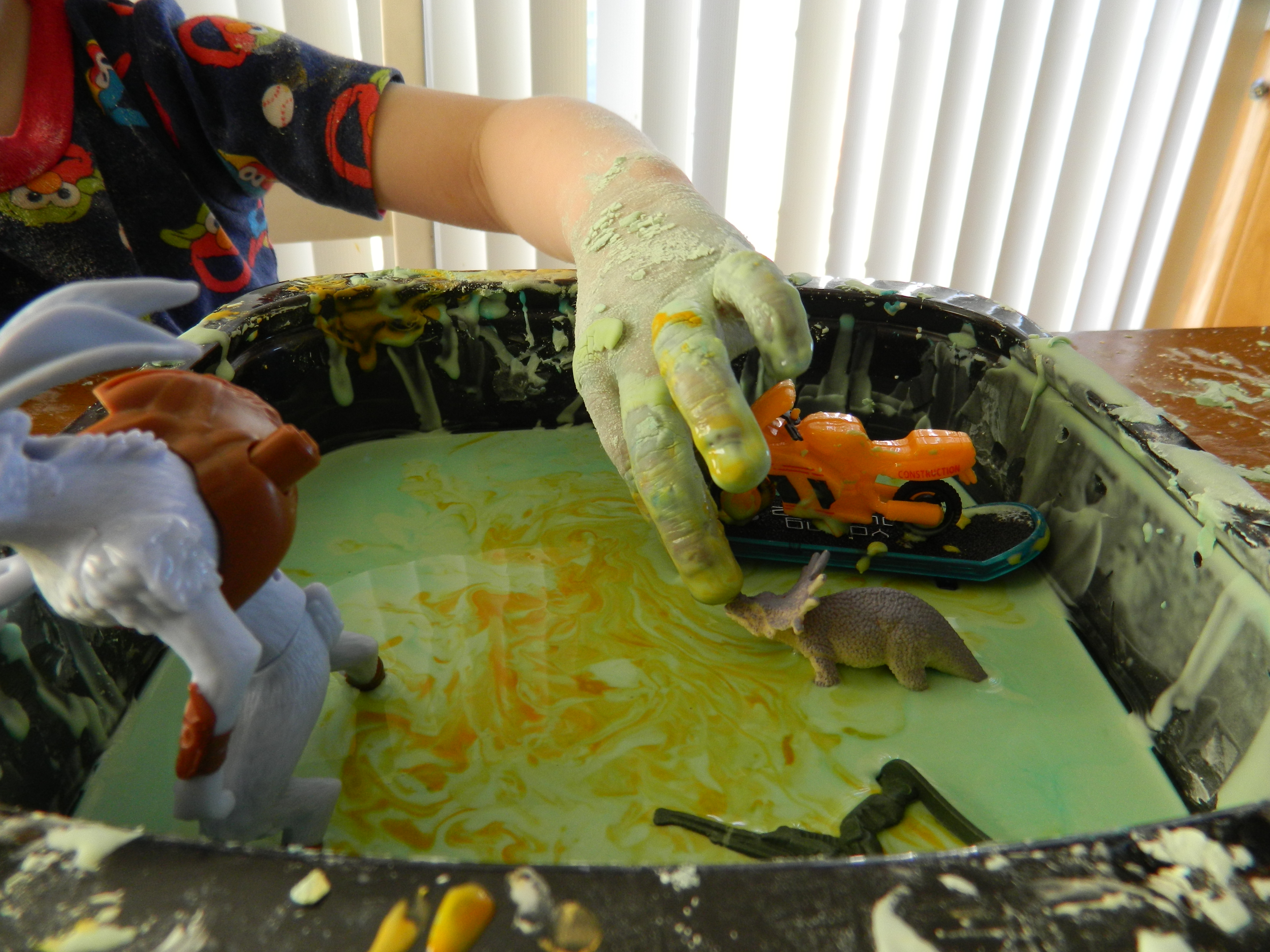 I absolutely love it when he comes up with new ideas while we’re doing an activity together. He asked if he could add some cars and toys to the “Gooblic” and I ran to get some. {I wanted to make sure he didn’t put any in there that would be ruined by the mix}
