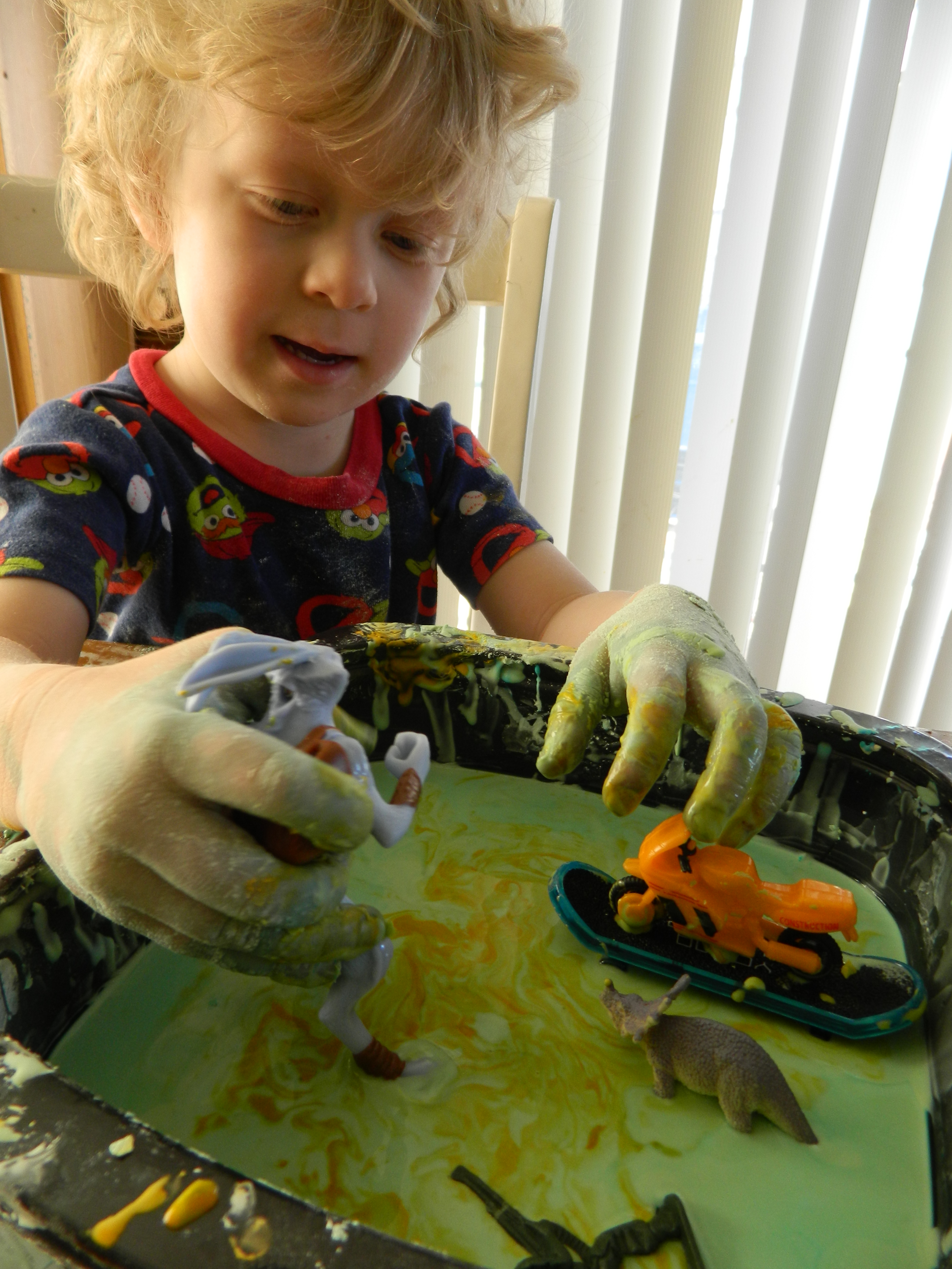 He played and rescued his toys over and over again and would playfully yell “Oh no!” as they sunk into the goo.