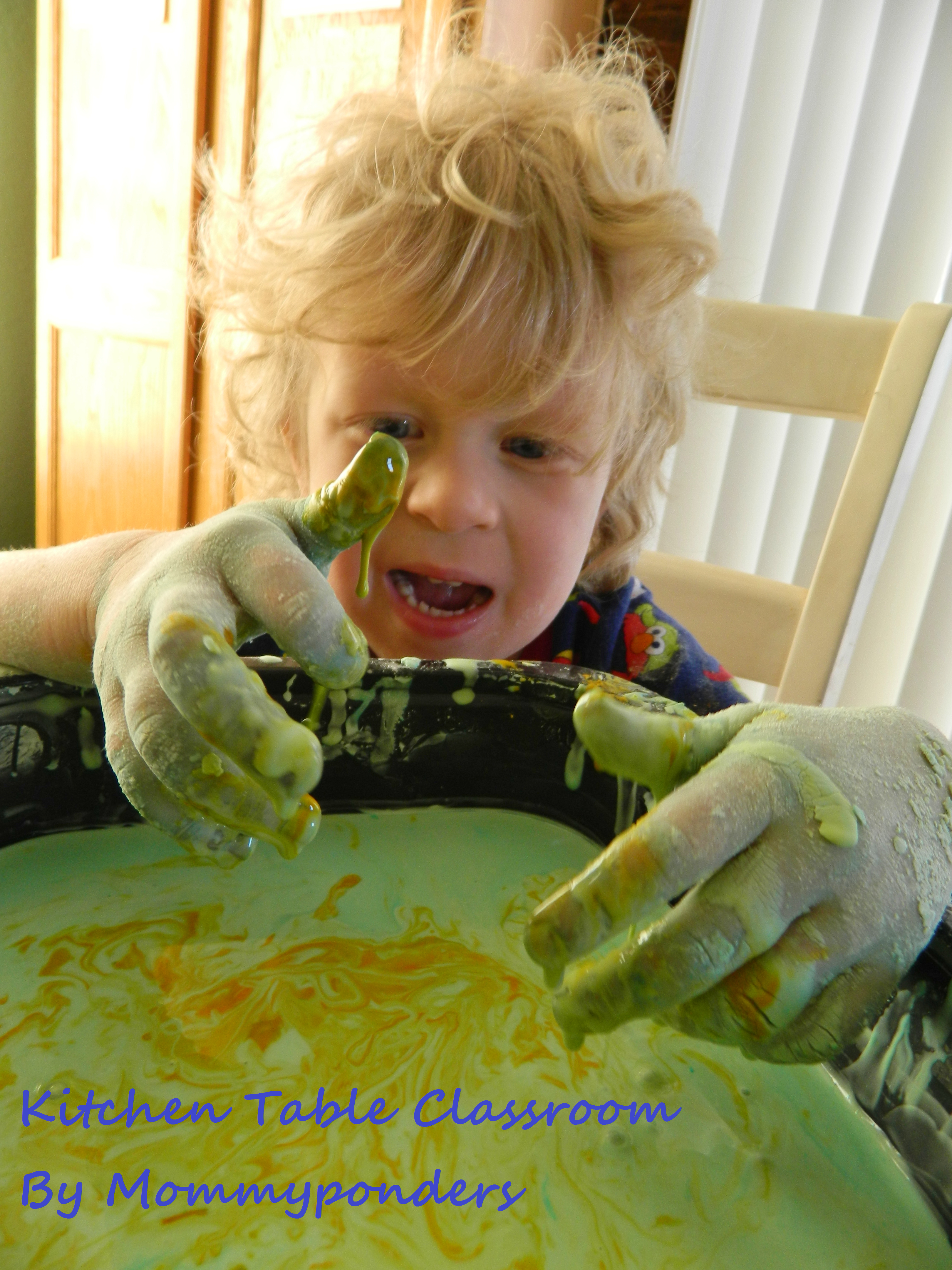 The basis of this activity was just to discuss two of the five senses: touch and sight. However, as we played more and more with this gooey fun stuff, Little was repeating my words and saying things like, “I observe the table is a mess!” and “I observe that I can’t see my army man’s face anymore.” {YAY!}