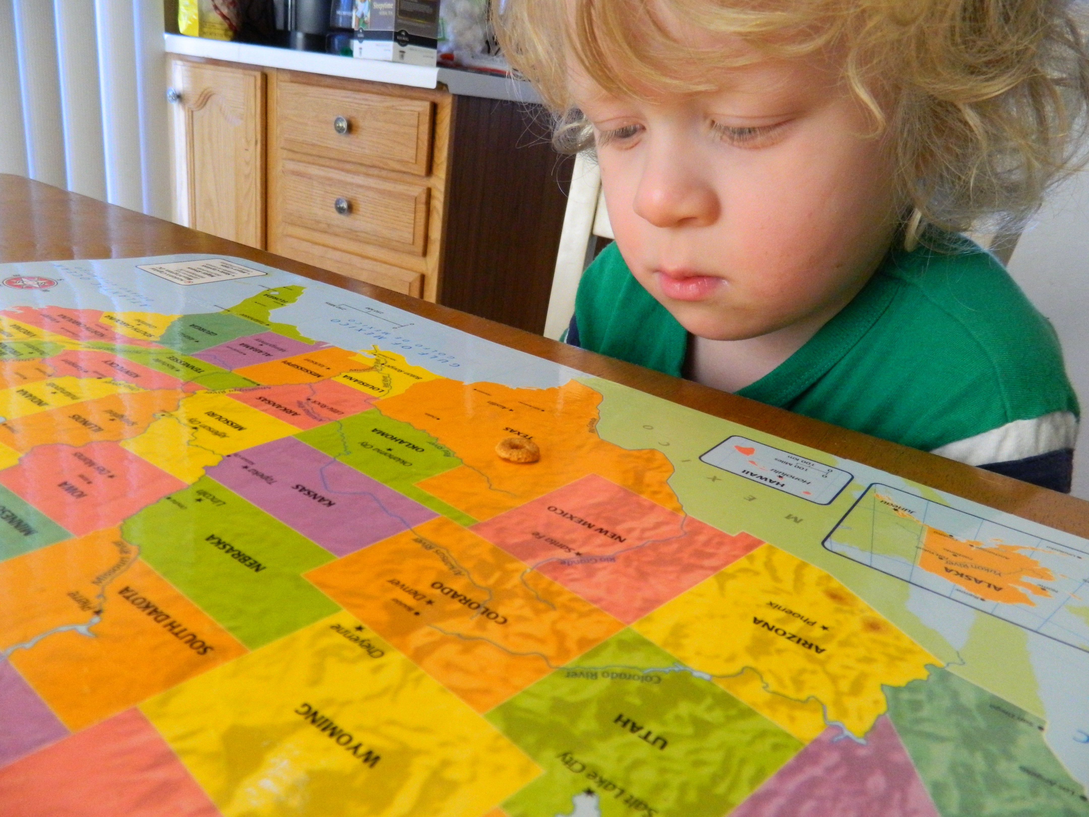 The game is very simple. I purchased a US place mat at Wal-Mart for $2.00 and I use his favorite cereal {Multigrain Cheerios} for the treat. We started with Texas, because that’s where we live. I simply put a Cheerio on Texas and he had to say the name before he could eat it. I was going to make this a once a week thing, but he loved it so much he asked to play the game again the next day! Right now we have five states memorized. He knows Texas, California, Kansas, Florida, and Washington. Some I let him select, others I chose because I thought their location or shape would be easy for him to remember. Next week we’re adding Louisiana to the mix. For a quick review, I just point to the states and ask him and he immediately knows them; no treat required.
