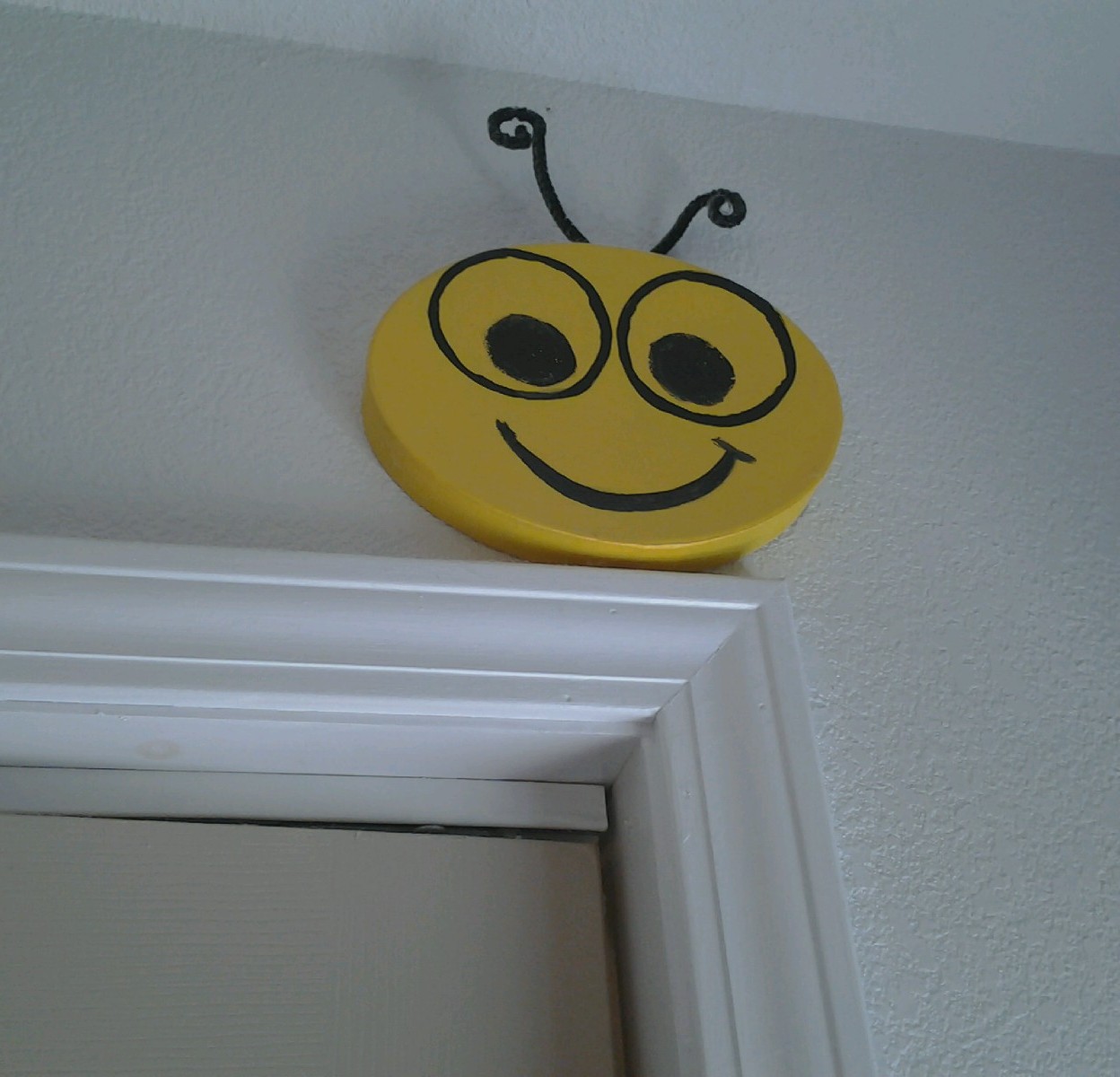 Here’s our little Gold Bug hiding above Little’s closet door! I think he looks pretty similar to the real thing. I simply purchased an oval paper mache box lid from Hobby Lobby and painted it yellow, painted his big eyes and smile and then made his antennae out of pipe cleaners. Done! Little still loves to look around and find the Gold Bug in his room 🙂